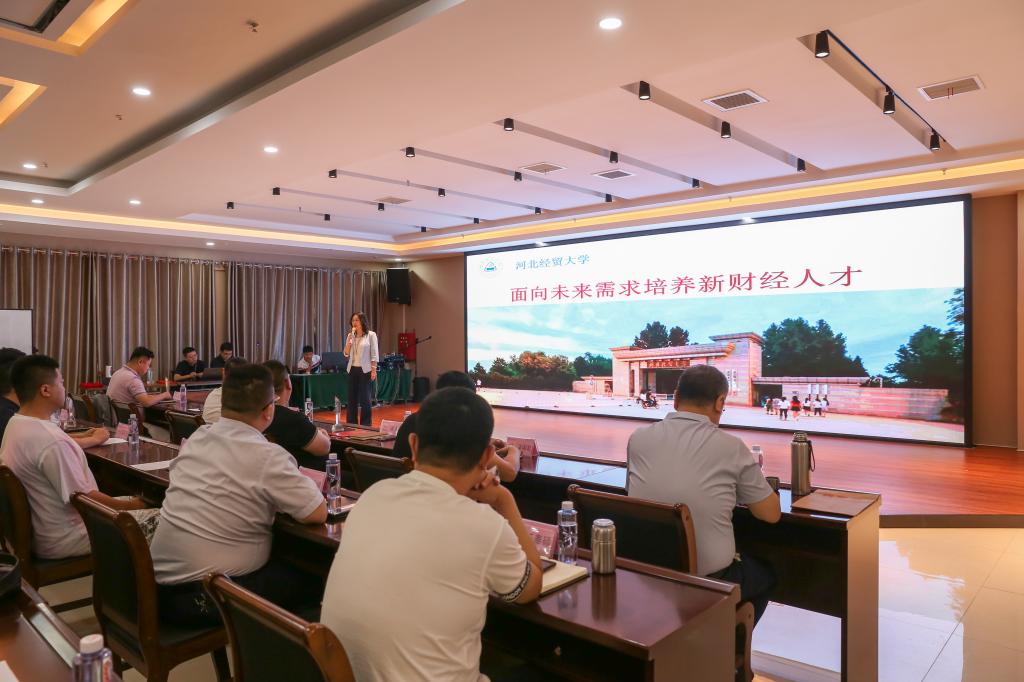 在河北省青年民营企业家商会第一届四次理事会上,祁红梅做了《面向未来需求培养新财经人才》的专题演讲,首先全面介绍了太阳成集团tyc151cc的办学宗旨、学科优势专业建设等情况,重点介绍了以新财经实验班为代表的面向经济社会未来发展培养新财经人才的战略和具体实现路径;其次以管理科学与工程公司为代表介绍了二级公司的专业建设、人才培养和社会服务等情况;最后介绍了以需求为导向的员工就业、用人单位满意度等情况,并做了2021年本科招生详情宣讲。