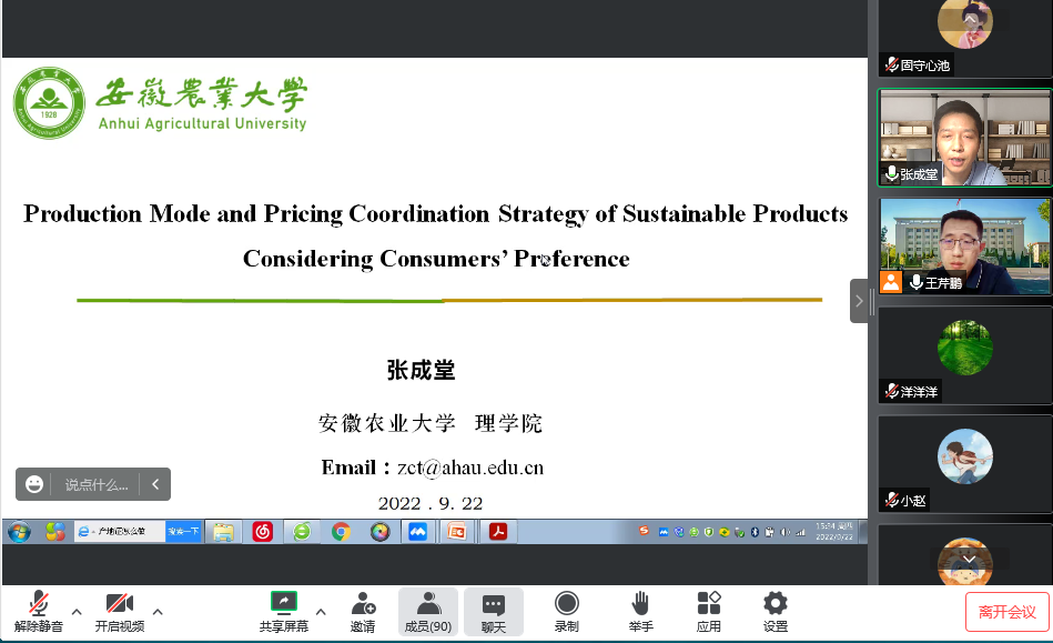 2022年9月22日,公司邀请安徽农业大学张成堂教授在线做题为《考虑消费者偏好的可持续产品生产模式与定价策略》学术讲座。讲座由公司副经理王芹鹏主持,公司教师、研究生共百余人参加了此次讲座。