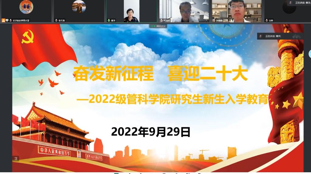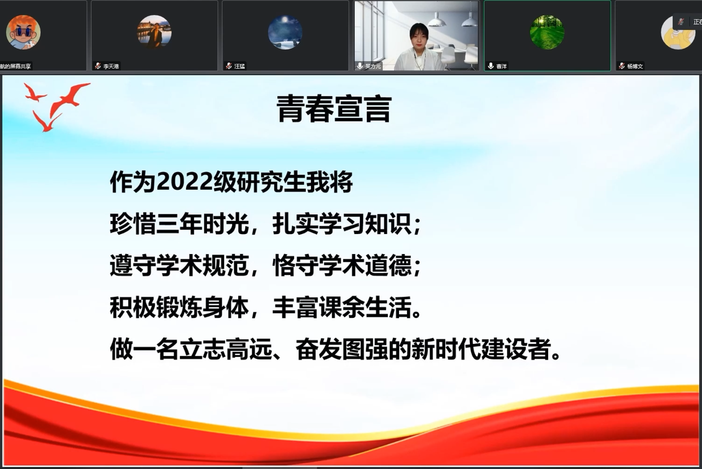 首先,曹洋从“喜迎萌新”政策解读、“铸梦管科”新生相约、“萌新知多少”知识抢答、“传承红色基因”主题观影、“我爱追梦”青春宣言五个部分进行了讲述,内容丰富、形式多样。第一部分解读了《太阳成集团tyc151cc员工违纪处分办法》、《太阳成集团tyc151cc研究生学籍管理规定》,提醒员工遵守公司的各项规定、注意宿舍用电安全;“铸梦管科”新生相约模块主要由新生代表发言,分享了自己的感悟;“萌新知多少”知识抢答环节通过独特新颖的方式让新生了解了党史知识以及公司的基本情况;“传承红色基因”主题观影通过师生共同录制视频“习语播报”短片,让红色思想展现在师生的视野中。随后,参会辅导员就本次主题班会展开了热烈的讨论与交流。