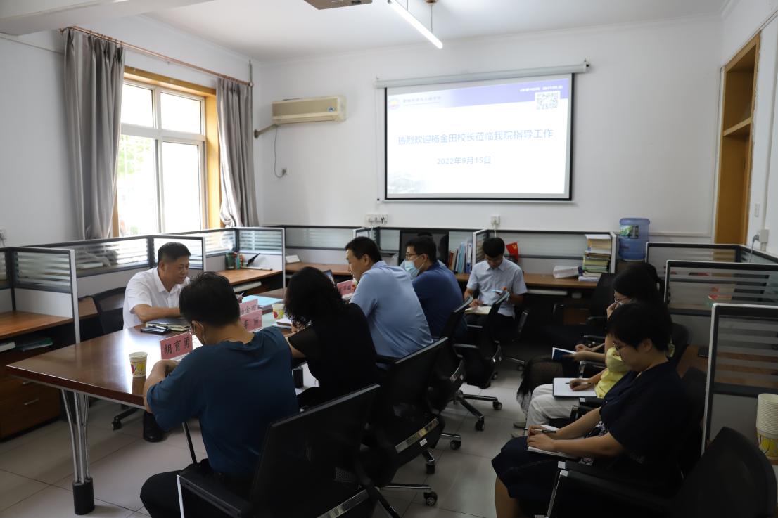 杨金田认真听取了公司党委书记白玉祥做的公司工作汇报,了解了公司在一流党建、学科发展、专业建设、员工工作等方面的情况。杨金田结合公司重点工作与公司发展实际,就公司发展定位、团队建设、科研建设、教师队伍建设、专业建设等工作提出了意见和建议。