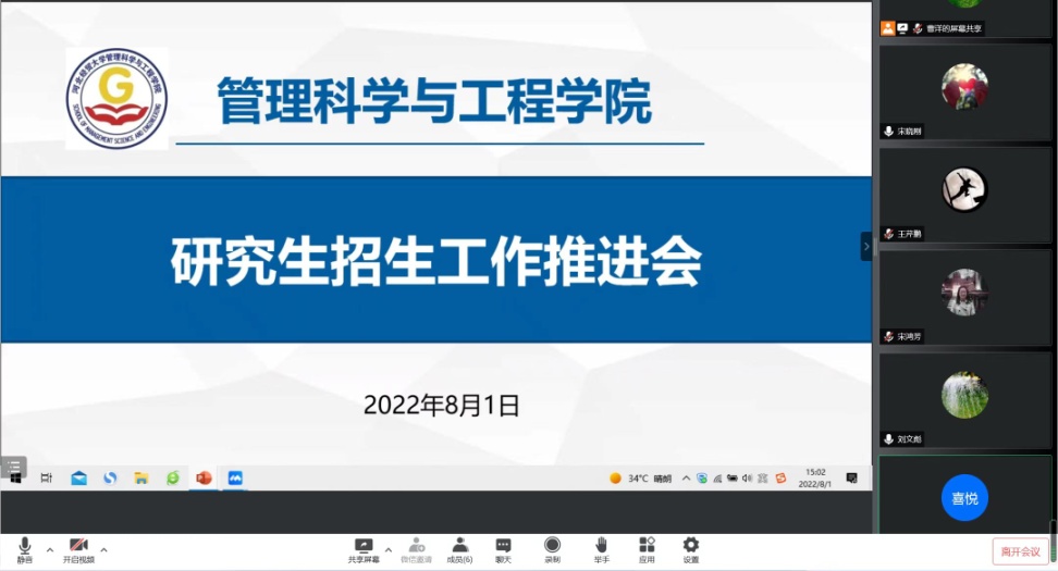 2022年8月1日,公司在腾讯会议线上召开研究生招生工作推进会。应公司邀请,河北广播电视台编审刘文彪老师出席会议。公司副经理王芹鹏、学硕导师组组长宋鸿芳、MEM专硕负责人宋晓刚、学科秘书曹洋参加会议,会议由经理祁红梅主持。祁红梅根据公司近三年研究生招生情况,对2023年的研究生招生工作进行了详细安排、布置。在公司网站建设方面,与参会老师讨论了如何优化研究生招生、培养等模块。刘文彪介绍了新闻传播的特点、新闻稿件写作的注意事项,并围绕如何做好网络招生宣传进行具体指导。参会老师对公司研究生招生宣传片文案,进行了集体探讨。祁红梅做总结发言,各位招生负责人要继续完善管理科学与工程学硕和工程管理专硕的宣传材料,开展有针对性的招生宣传,进一步提高招生宣传工作的成效。