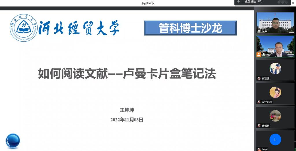 2022年11月3日,公司王坤坤博士通过腾讯会议平台做了题为“如何阅读文献——卢曼卡片盒笔记法”的学术讲座。讲座由大数据管理与应用教研室主任张雪峰主持,公司及相关公司教师、研究生及本科生共70余人参加了此次讲座。