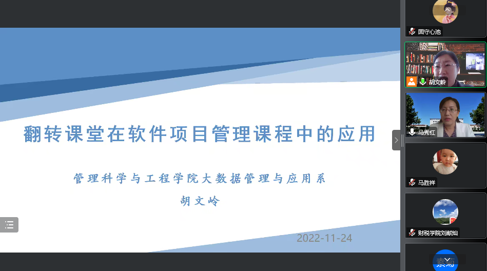 2022年11月24日,由教学评估与教师教学发展中心主办,公司承办的本年度第85期教学沙龙活动顺利举行。大数据管理与应用系副教授胡文岭应邀做“翻转课堂在软件项目管理课程中的应用”交流分享。会议由数管系教研室主任马秀红主持,公司全体教师参加。