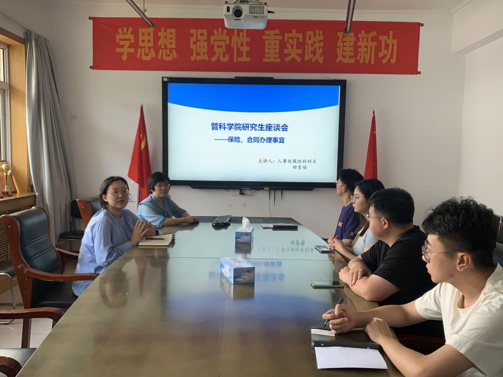 为提升研究生职业规划意识,6月12日,管理科学与工程公司邀请人事处保险科科长田雪瑶举办“保险、合同办理事宜”座谈会。讲座由研究生辅导员曹洋主持,在校研究生参加。