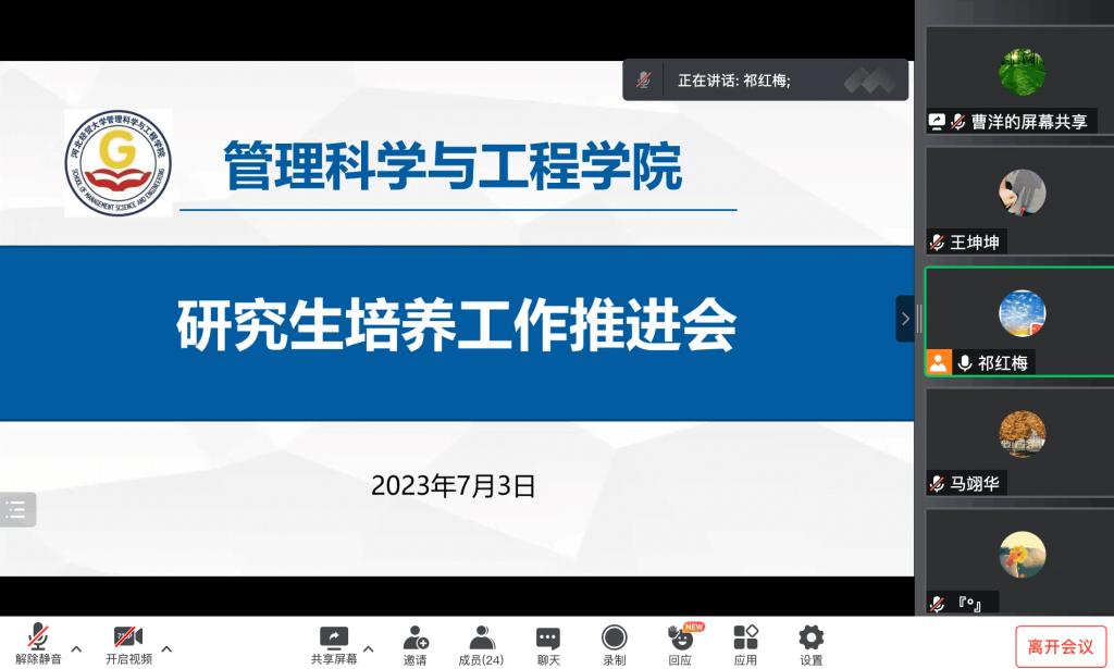 祁红梅从招生、管理、培养和学位工作,四个方面分析了公司研究生教育现状和面临的挑战,布置了暑期重点工作。她指出推进研究生教育高质量发展:一是以立德树人为使命,规范培养过程管理,导师定期与研究生开展学术研讨或进度汇报活动,实时掌握研究生学习和科研进展;二是以新财经教育改革为主线,鼓励师生外出开展移动课堂、研学等活动,进一步拓宽公司研究生的视野;三是以过程管理为抓手,加强论文开题、预答辩、送审及答辩等培养环节的审查力度。