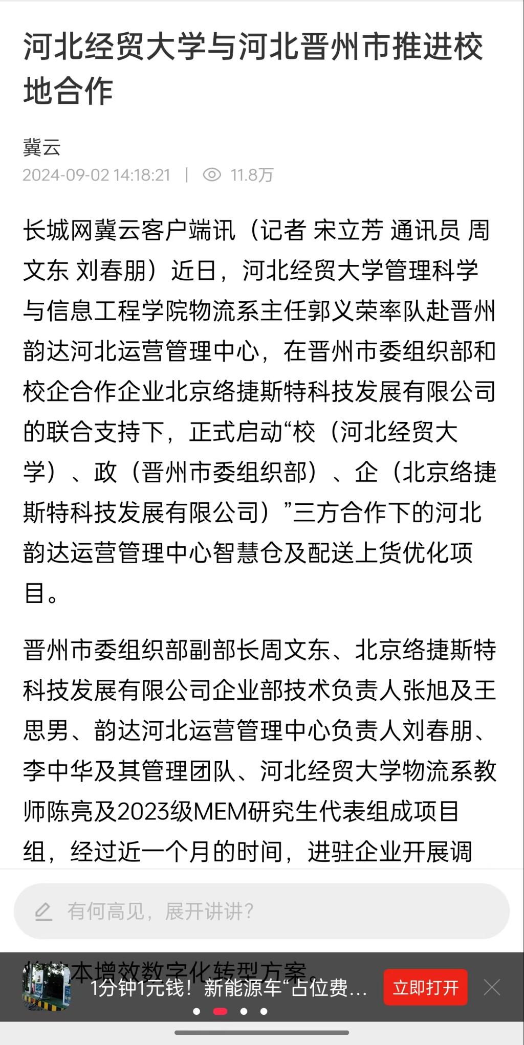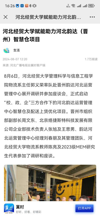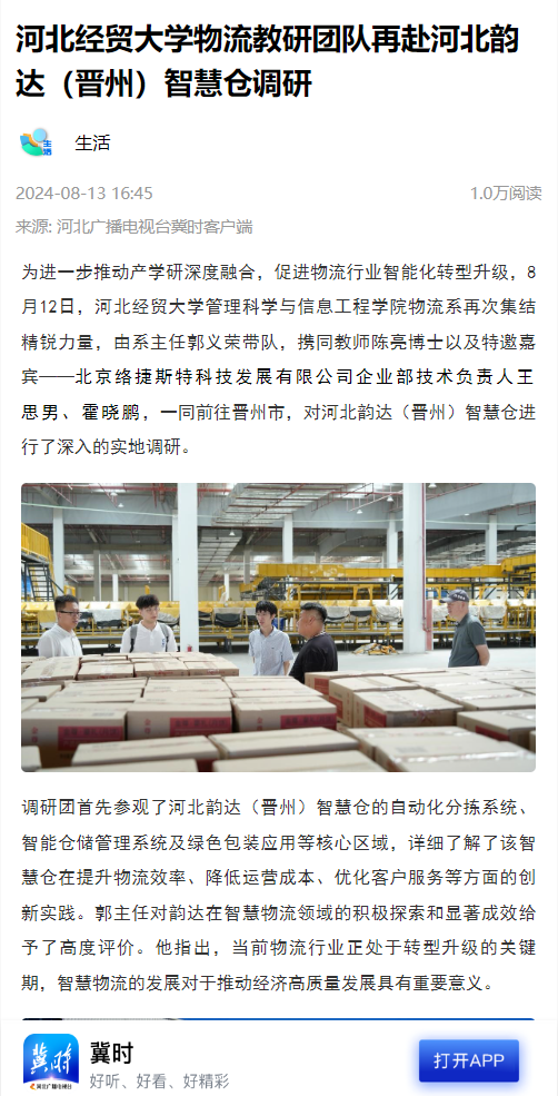 4.河北广播电视台冀时客户端:太阳成集团tyc151cc物流教研团队再赴河北韵达(晋州)智慧仓调研。https://web.cmc.hebtv.com/cms/rmt0336_html/0/0rmhlm/mt/sh/fbt/11585416.shtml?share=true